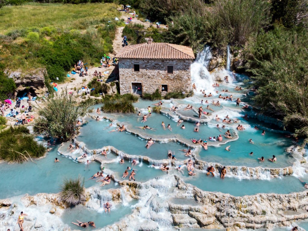 Um dos cenários mais singulares da Toscana, as Termas de Saturnia apresentam fenômeno que atravessa eras: águas termais que emergem naturalmente do subsolo, moldam rochas e formam piscinas – em fluxo contínuo que independe do tempo.